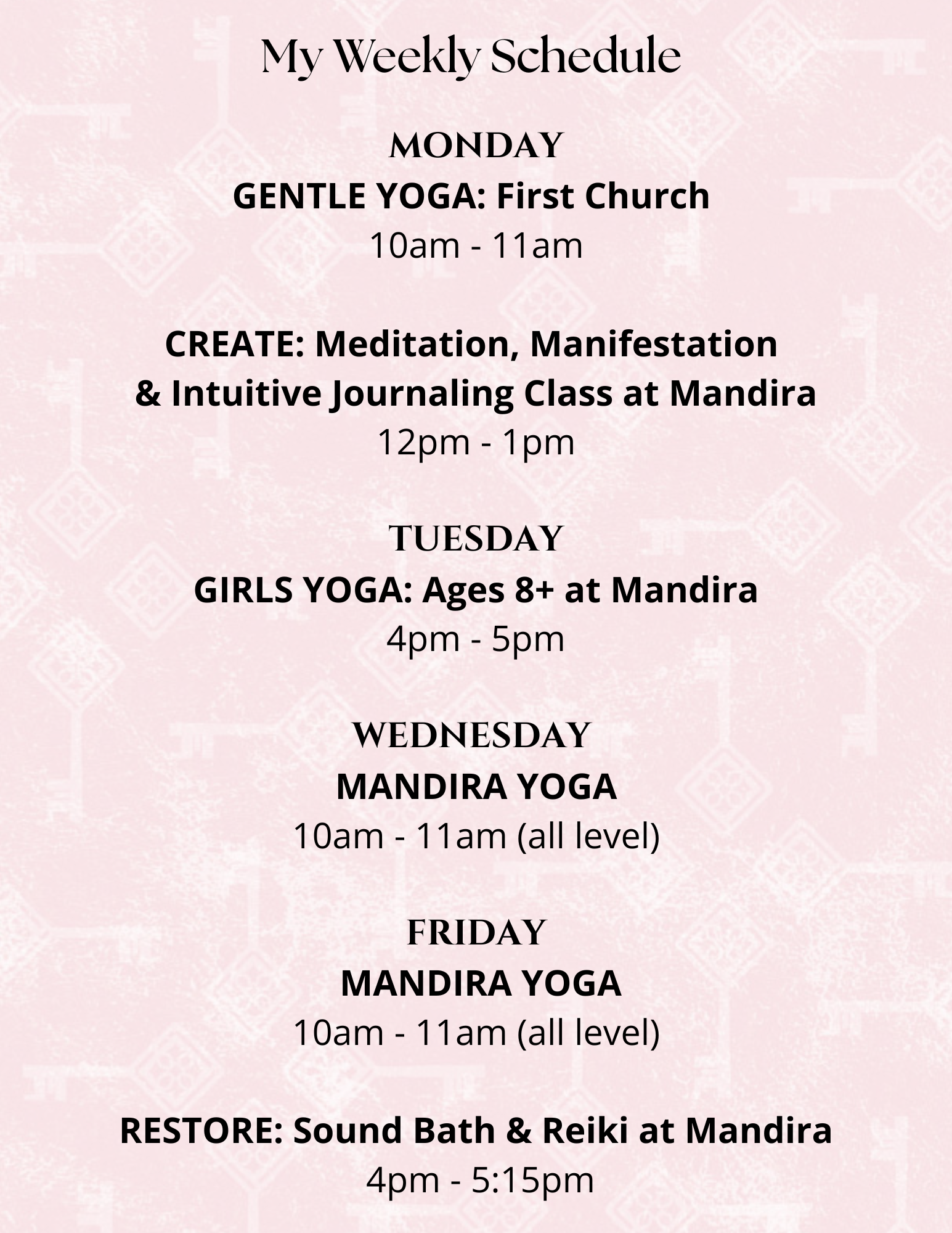 I offer group and private yoga, meditation and breathwork classes. My unique teaching stye leads intention, integrating philosophy, spirituality, poses, breathwork and energetic tools to calm and regulate the central nervous system (along with all of the other systems within the body, mind emotions and spirit)