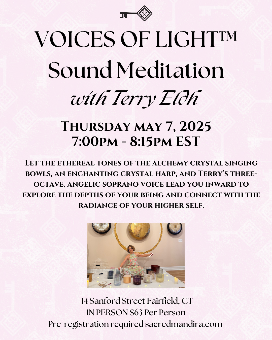 Let the ethereal tones of the alchemy crystal singing bowls, an enchanting crystal harp, and Terry’s three-octave, angelic soprano voice lead you inward to explore the depths of your being and connect with the radiance of your higher self.