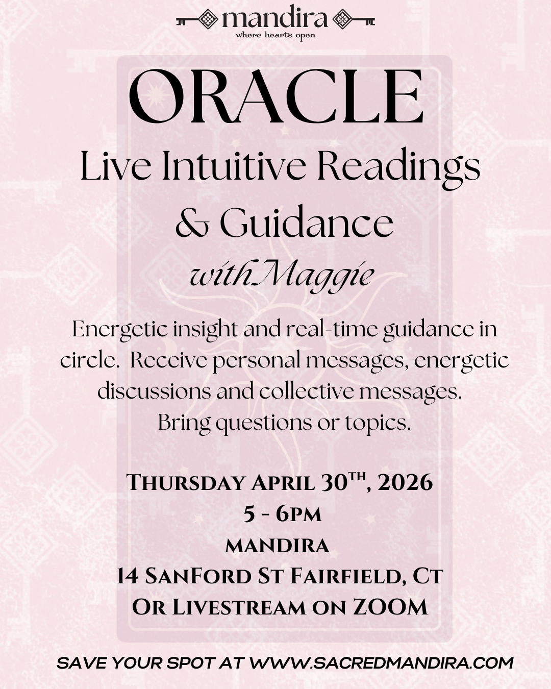 We sit in circle as Maggie invokes the highest releams of energy and light. The messages come through in the moment. You can expect intuitive reads, energetic insight, and guidance based on what is present and ready to be seen. Messages are supported by Maggie’s intuitive gifts and oracle cards for clarity, confirmation, and direction.